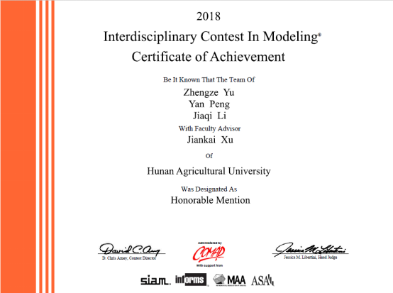 (理学院 雷雨亮)近日,由美国数学及其应用联合会主办的2018年美国(国际)大学生数学建模竞赛(MCM/ICM)传来喜讯,我校理学院王访、李绪孟和刘圣勇老师分别指导的3个参赛队获得美国大学生数学建模竞赛国际一等奖(Meritorious),许建开、伍朝华两位老师分别指导的参赛队获得国际二等奖(Honorable Mention),在该赛事奖项等级和数量上都取得重大突破。