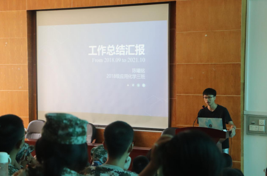 会议伊始,顺利保研厦门大学的陈曦铭学长详细讲述了他的科学研究历程,并分享了他目前所取得的科研成果。顺利保研中国科学技术大学的雷隆惠学姐则结合她的大学经历给予了新生一些宝贵建议:珍惜美好的大学时光,增长见识广泛交友,独立思考,提升能力,树立正确的的目标并努力追寻。