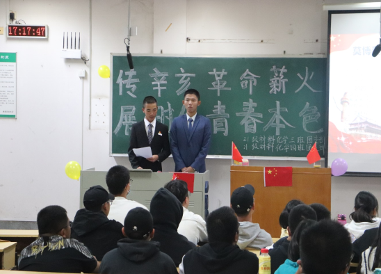 本次会议以“传辛亥革命薪火,展时代青春本色”为主题,通过班级合作的形式召开。会议前,会场红色为主色进行了红旗和气球布置,参会人员佩戴团徽参加会议。会议伊始,主持人阐述本次会议的目的,介绍本次会议的背景。紧接着,会议围绕着辛亥革命的兴起、辛亥革命的历程、辛亥革命的伟人展开系列学习。