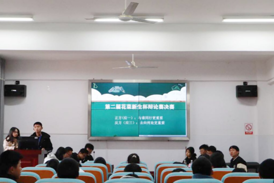 本场比赛的辩题为“人生路口上往往有许多条路要走,当你位于人生的路口,你认为去向何处和与谁同行哪者更为重要?”正方是应用化学一班代表队,他们认为“与谁同行更重要”;反方代表队来自应用化学三班,他们的观点是“去向何处更重要”。