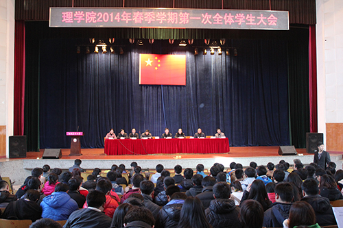 2月20日下午,学院于大礼堂召开2014年春季学期第一次全体学生大会,团总支书记黎慧钦老师担任主持人,学院全体院领导、各系正副主任、关工委老师、班主任老师、学工组老师、理学院2010、2011、2012及2013级全体同学参与此次会议。会议伊始,党总支副书记刘庆华老师就2013年下学期学生工作做了详细地总结,同时也对2014年上学期工作要点做了报告。随后,副院长邹锐标老师宣读了《2013年下半年获奖集体及个人名单》,与会领导为获奖集体及个人一一颁发了荣誉证书,同时他鼓励学院全体同学向获奖者们学习。接着,优秀学生代表张迎吉就自身学习的方法和大家共勉,希望大家加强自我学习,积极参与学院的各种活动。最后,党总支书记邓白平老师作了总结发言,他指出我院以实践育人为教育模式,以达到助人成才的目标,期望大家起于行、砺于行、止于行,并预祝同学们在新的学期里取得更加优异的成绩。此次大会在昂扬的校歌中圆满结束。此次会议的成功召开使同学们对理学院的工作情况有了更深的了解,促使同学们意识到在新学期中需要更加严格要求自己,同时积极参与学院的各项活动。理学院宣传部 王佳丽