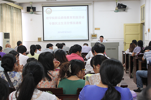 9月4日下午,理学院在三教学楼305多媒体会议室召开了党的群众路线教育实践活动专题民主生活会情况通报会。学院领导班子、全体教师、学生党员代表参加了会议,会议由院长周文新主持。院党委书记邓白平代表学院领导班子作了《专题民主生活会情况通报》。第一部分是民主生活会会前准备情况,包括扎实开展学习讨论,打牢思想基础;广泛征求意见,认真查摆“四风”突出问题;开诚布公,全面开展谈心交心;深刻剖析,认真撰写对照检查材料;制定具体工作方案共五个步骤内容。第二部分是专题民主生活会开展批评和自我批评的情况,包括党委书记带头开展批评和自我批评情况;班子成员对党委书记邓白平同志的批评情况;班子成员开展自我批评、剖析思想根源及提出整改思路和措施的情况;班子成员开展相互批评情况等四个方面。会议上还传达了学校党委副书记卢向阳及学校第二督导组对民主生活会的点评和综合评价意见。邓白平代表学院领导班子成员表示,要以这次民主生活会为新的起点,始终保持清醒认识,一切按照活动要求,督导组的指示,牢固树立开拓创新意识,切实抓好查摆问题、开展批评环节后续工作,并认真准备整改落实、建章立制环节相关工作。坚持统筹兼顾,把教育实践活动与推进学院科学发展有机结合起来,与党员干部履职尽责结合起来,确保教育实践活动与当前学院工作两不误、两促进,确保高质量完成教育实践活动的各项任务,向学校党政和学院师生员工交一份满意的答卷。