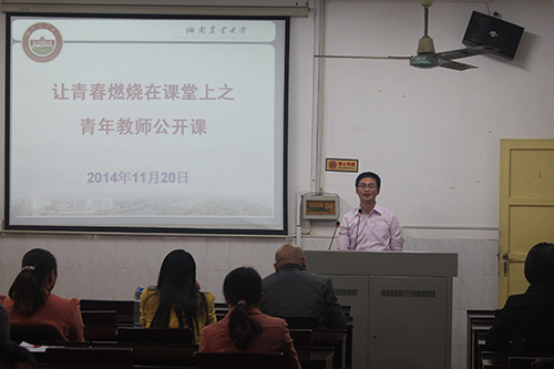 2014年11月20日下午,理学院在3教学楼305多媒体教室开展了一次青年教师公开课活动,活动由李辉勇副院长主持,周智和肖峰老师主讲,全体教师参加了活动。周智和肖峰老师分别讲授了《不饱和烃的亲电加成反应》和《抽样方法和样本可能数目》。随后,资深老师对他们的授课进行了点评,指出他们精神饱满,教态自然,基本功扎实,内容丰富,教学方法运用恰当,教学水平有了很大的进步,并针对他们教学上的一些不足,结合自己多年的教学经验给两位老师提出了很好的建议。点评后全体与会老师就如何上好课进行了热烈的讨论。此次青年教师公开课是理学院让青春燃烧在课堂上主题活动的一部分,目的是为了加强教师之间的相互交流、相互学习、取长补短,不断提升青年教师教育教学水平,从而进一步提高学院整体的教学水平。