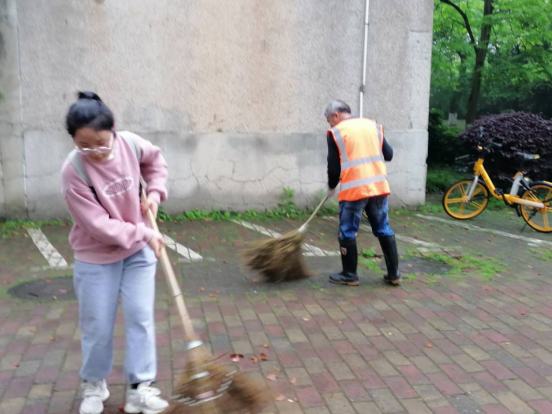 这天早上,凌晨六点,天蒙蒙亮,我院24名志愿者来到芷兰宿舍大门集合,今天他们有一个重要的任务,跟着环卫工人一起打扫校园,亲身体验环卫工人在打扫、收集垃圾等工作时付出的辛勤汗水。在活动现场,大家手拿着扫帚,弯着腰,把马路上的垃圾、树叶扫成一堆,经过志愿者的共同努力,原本铺满树叶的马路变得干净宽敞。在这一个多小时的劳动下,有不少志愿者感到腰酸背痛,但从他们眼里看到更多的是对环卫工人这份工作的理解与尊重。