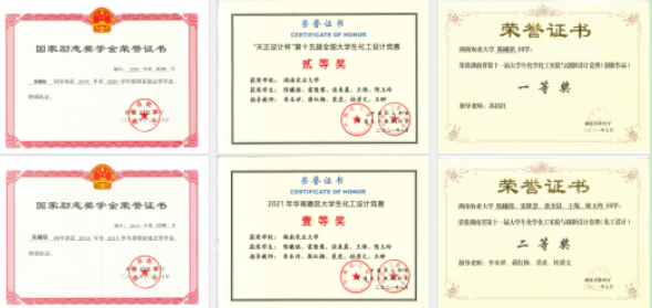除了积极参与创新实验,课外学科竞赛也是让能力得到锻炼的好方法。在校期间,陈曦铭先后作为负责人组织参与校 “互联网+”大学生创新创业大赛、湖南省第六届大学生化工设计竞赛、湖南省大学生课外化学化工类创新作品竞赛、全国大学生化工设计竞赛、全国生命科学创新创业大赛等多项竞赛。回忆起走过的竞赛之路,他说“在比赛中,我们不仅要掌握充分的技能,更要学会在比赛中学会团队合作和坚持不懈。道虽学不行不至,事虽小不为不成,没有比脚更长的路,也没有比人更高的山,也许面对问题最大的挑战就是说服自己。”