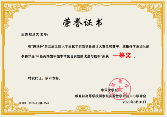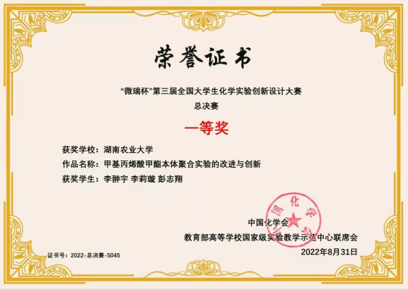 (Vwin德赢唯一官方网站 李杭新 庄淑贤)近日,“微瑞杯”第三届全国大学生化学实验创新设计大赛总决赛落下帷幕。经过激励角逐,我院2019级材料化学一班学生李翀宇、李莉璇、彭志翔携参赛作品“甲基丙烯酸甲酯本体聚合实验的改进与创新”,在学院王锦老师和桂清文老师指导下,斩获全国总决赛一等奖。