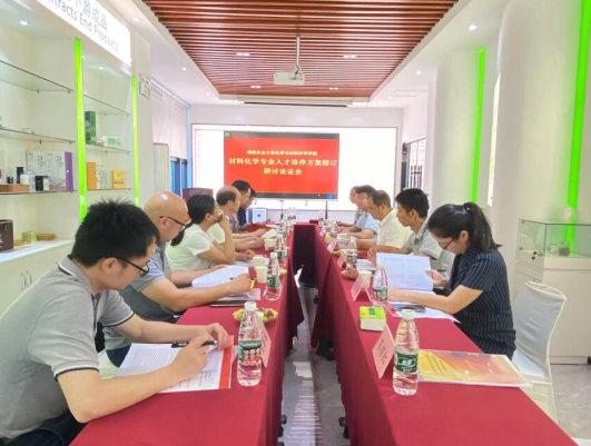 研讨会上,周文新院长提出此次研讨会在绿蔓科技举办是材料化学专业产学研政协同育人模式的新尝试,并代表学院聘请专家为“材料化学专业建设指导老师”。材料化学专业负责人喻鹏介绍了近年来材料化学专业建设情况和2022版材料化学专业人才培养方案修订情况。教务处肖化柱副处长介绍了我校本科专业人才培养方案修订相关背景与要求并表示将大力支持培养方案的修订。在此基础上,与会专家审核论证了2022版材料化学专业人才培养方案,各位专家结合国家及地方人才培养需求及我校办学特色,为材料化学专业人才培养方案的修订提出了宝贵意见。最后,院党委书记胡小元总结发言。